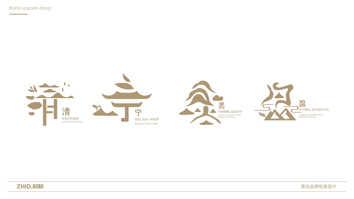 雾出标志融入“雾”与“茶叶”的元素与文化进行融合,一个新的图标体现茶叶文化,加入“人”的小图标,体现茶与人,茶与自然,茶是我们的好朋友的品牌理念,一种人与自然天人合一的融合,文化与自己融合让品牌更具历史感与品牌感。不同的传统图标来表达不同产品的档次与不同产品系列,对小系列“清、宁、灵、盈”进行字体设计,字体中融入山水、茶叶、风火等元素,形成产品图标,不同的材质形成不同的产品系列“袋装、盒装、棉纸装”等。