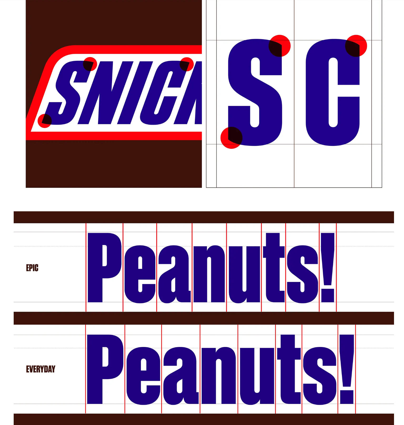 在开发全新字体系统前,设计团队首先对士力架经典的标志字体进行了精心优化。通过微调字母间距、梳理结构关系并修正细节,使这一深入人心的标志变得更加清晰与平衡。这一步骤为后续扩展成完整的字体家族奠定了坚实的基础。