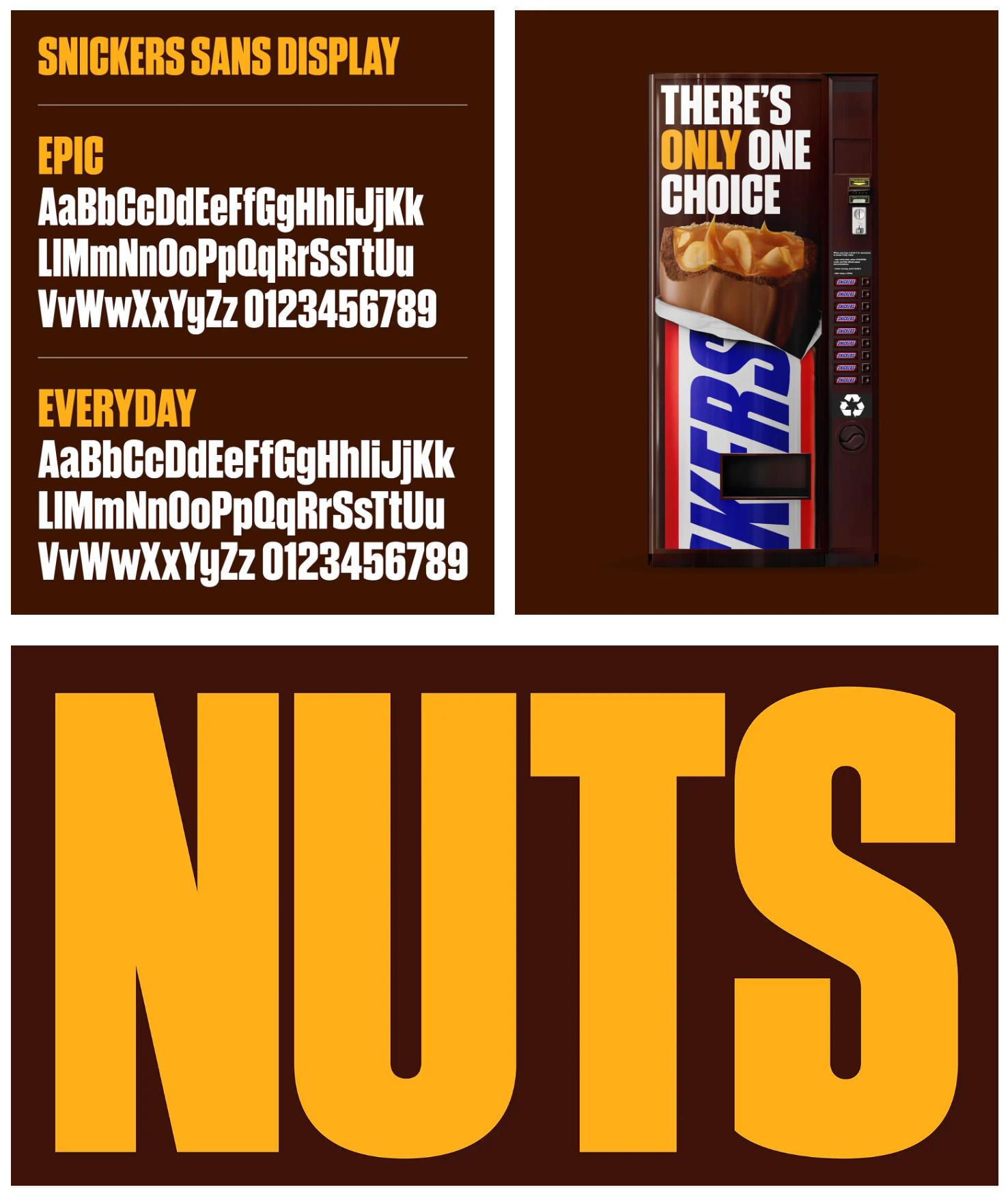 SNICKERS Sans Display(展示字体):主要用于广告标题、包装设计等需要突出视觉冲击力的场景。该系列下分 「Epic」 和 「Everyday」两种风格,可根据传播场景调整视觉张力,在保持品牌个性的同时提供更灵活的表达。