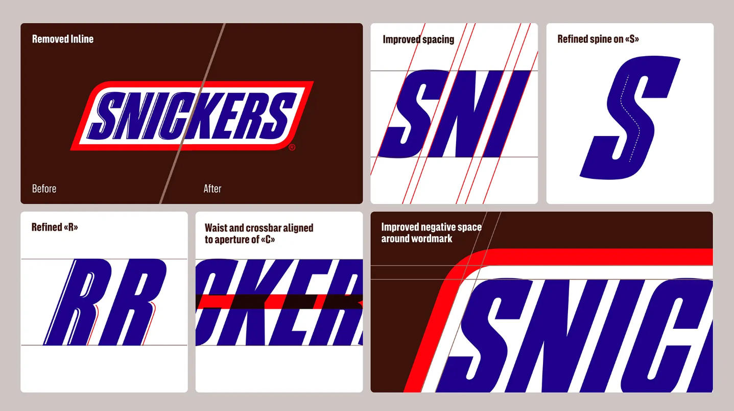 在开发全新字体系统前,设计团队首先对士力架经典的标志字体进行了精心优化。通过微调字母间距、梳理结构关系并修正细节,使这一深入人心的标志变得更加清晰与平衡。这一步骤为后续扩展成完整的字体家族奠定了坚实的基础。