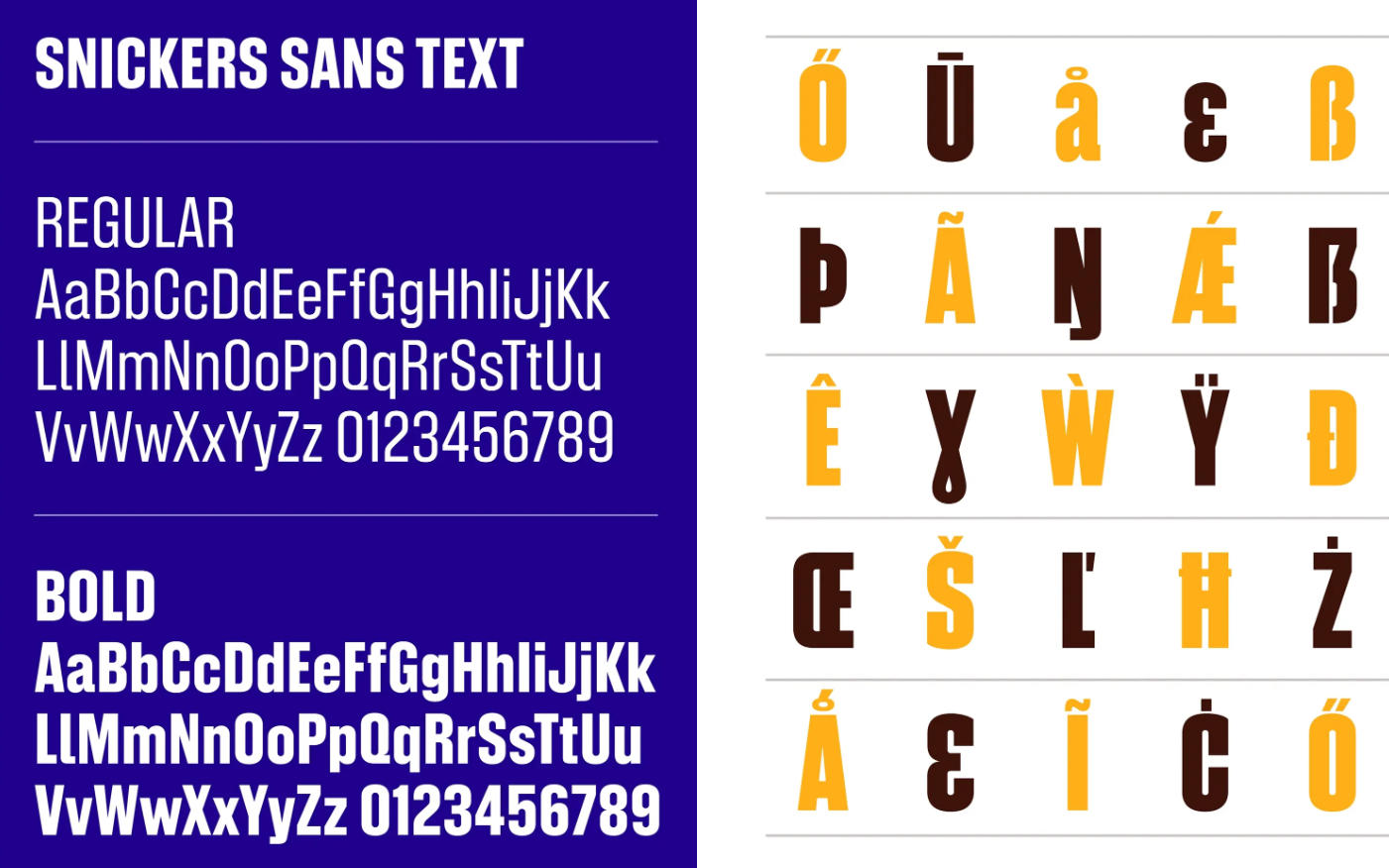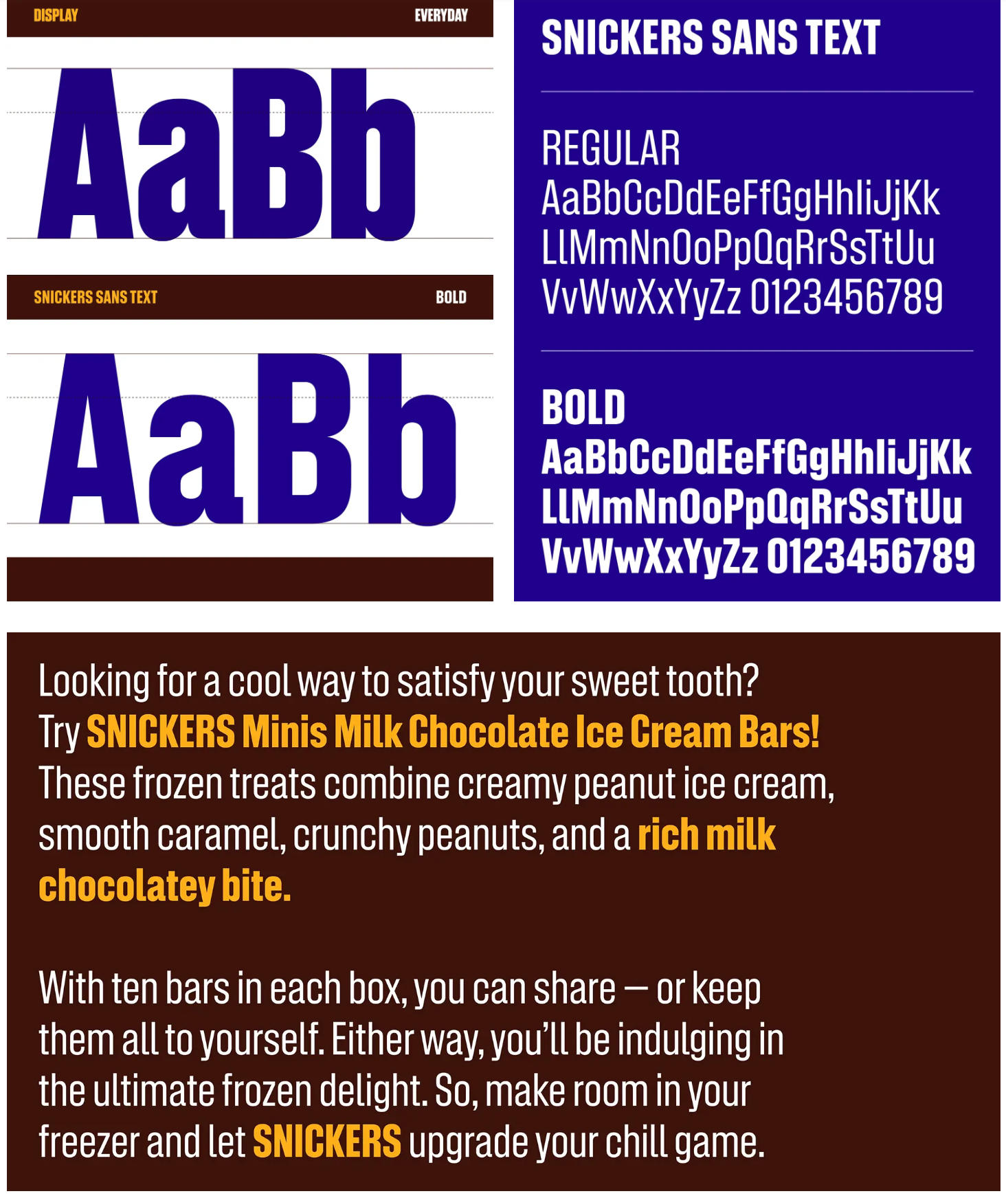 SNICKERS Sans Text(正文字体):更偏向功能性,提供 Regular 和 Bold 两种字重。该字体专为产品信息、数字界面及日常说明文本等小字号场景设计,在保证清晰易读的同时,依然保留了士力架独特的视觉特征。
